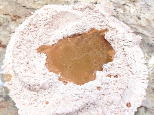 - Make a well in the middle and add all the liquid ingredients like almond oil, marsala, brandy, and aquafaba.